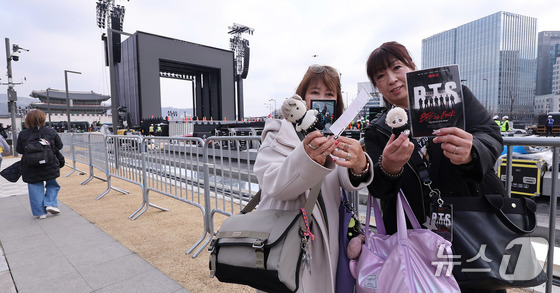방탄소년단(BTS) 완전체 컴백 공연을 하루 앞둔 20일 서울 광화문광장 공연장 앞에 대만에서 온 아미(ARMY·팬덤명)들이 굿즈를 들어보이고 있다. 2026.3.20 © 뉴스1 박지혜 기자