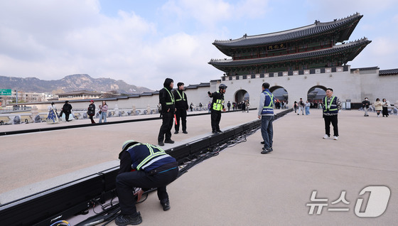 방탄소년단(BTS) 완전체 컴백 공연을 하루 앞둔 20일 서울 광화문 월대에서 관계자가 설치된 공연 조명 주변을 지키고 있다. 2026.3.20 © 뉴스1 박지혜 기자