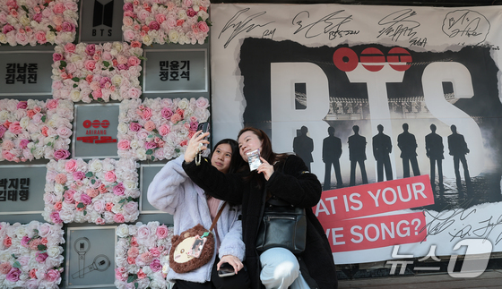 그룹 방탄소년단(BTS)의 광화문 공연을 앞둔 20일 서울 용산구 하이브 앞에서 팬들이 기념 촬영을 하고 있다. 2026.3.20 © 뉴스1 권현진 기자