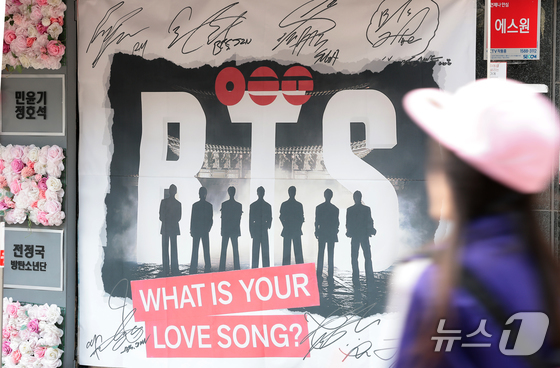 그룹 방탄소년단(BTS)의 광화문 공연을 앞둔 20일 서울 용산구 하이브 인근에서 팬들이 멤버들 혁수막 앞을 지나가고 있다. 2026.3.20 © 뉴스1 권현진 기자