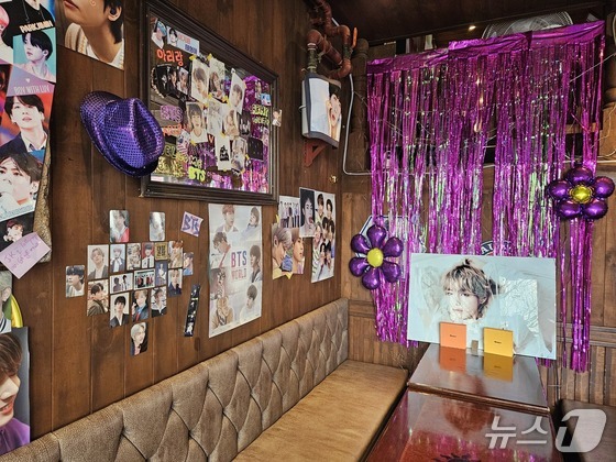 방탄소년단(BTS) 완전체 컴백 공연을 하루 앞둔 20일 서울 광화문 광장 인근 한 주점이 내부를 BTS와 관련한 물품과 색상으로 꾸민 모습. 2026.3.20 © 뉴스1 유채연 기자