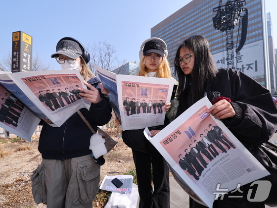 방탄소년단(BTS) 컴백 공연일인 21일 오전 서울 광화문광장에서 일본인 관광객들이 주요 일간지들이 발행한 BTS 특별판을 보고 있다. 2026.3.21 © 뉴스1 박지혜 기자