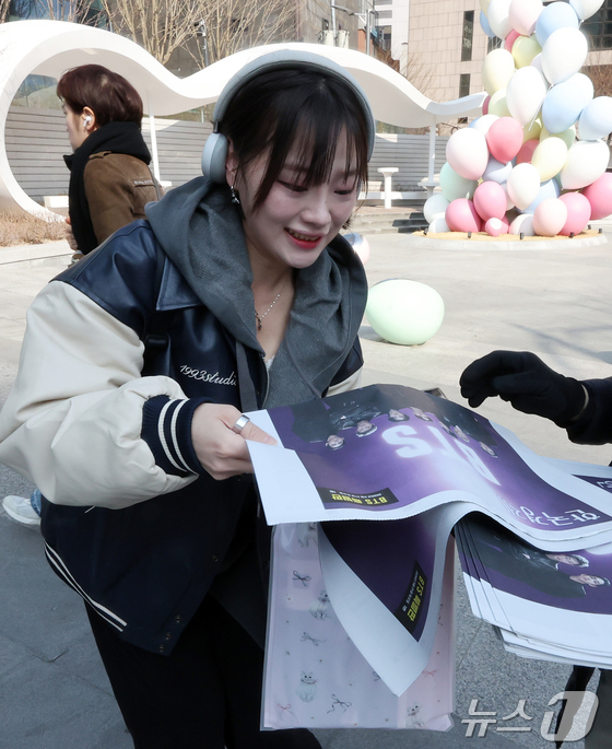 방탄소년단(BTS) 컴백 공연일인 21일 오전 서울 광화문광장에서 주요 일간지들이 발행한 BTS 관련 호외를 관계자가 배포하고 있다. 2026.3.212026.3.21 © 뉴스1 박지혜 기자