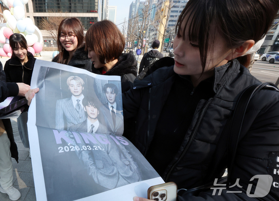 방탄소년단(BTS) 컴백 공연일인 21일 오전 서울 광화문광장 인근에서 외국인 관광객이 BTS 관련 특별판을 들고 기념촬영을 하고 있다. 2026.3.21 © 뉴스1 박지혜 기자