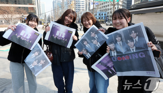 방탄소년단(BTS) 컴백 공연일인 21일 오전 서울 을지로입구역에서 일본인 관광객들이 주요 일간지들이 발행한 BTS 특별판을 들어보이고 있다. 2026.3.21 © 뉴스1 김진환 기자