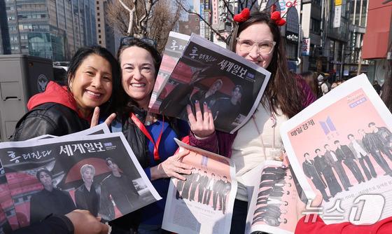 방탄소년단(BTS) 컴백 공연일인 21일 오전 서울 광화문광장에서 외국인 관광객이 주요 일간지들이 발행한 BTS 관련 특별판을 받고 있다. 2026.3.21 © 뉴스1 박지혜 기자