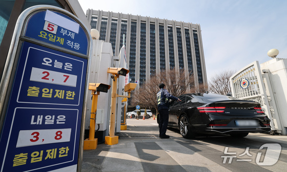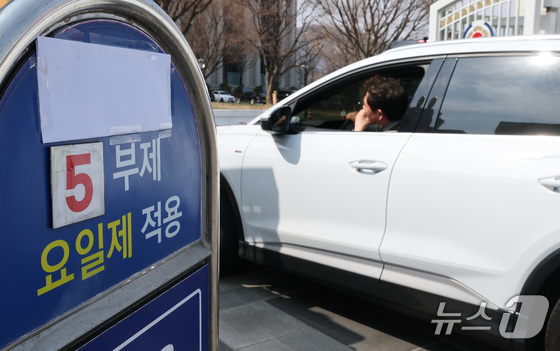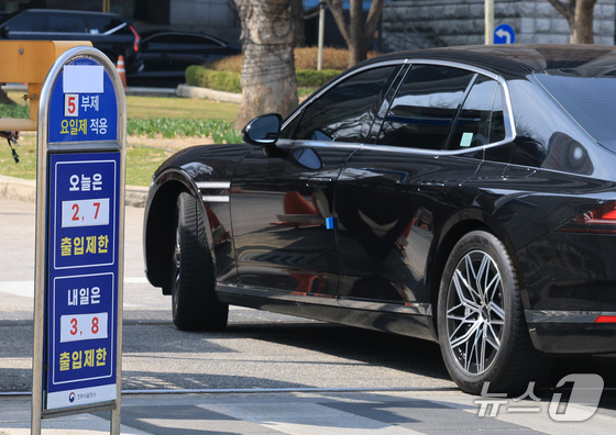 24일 서울 종로구 정부서울청사 앞에 원유 안보위기 ‘주의’ 경보 발령에 따른 공공 차량 5부제 안내문이 붙어있다. 공공부문은 에너지절약을 실천하기 위해 25일부터 전기차와 수소차를 제외한 승용차 5부제를 의무적으로 시행한다. 2026.3.24 © 뉴스1 임세영 기자