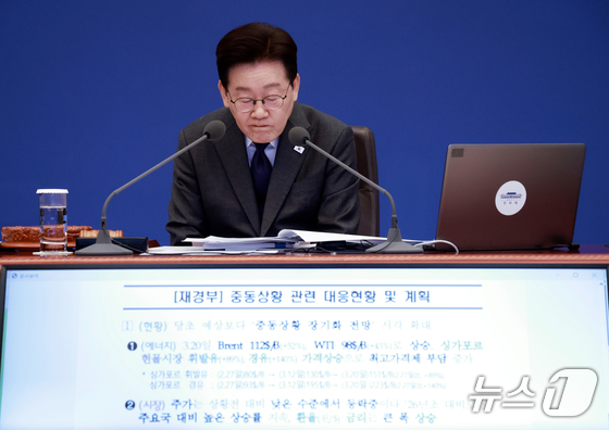 이재명 대통령이 24일 청와대에서 열린 국무회의에서 구윤철 부총리 겸 재정경제부 장관의 중동상황 관련 대응현황 및 계획을 보고 받고 있다. (청와대통신사진기자단) 2026.3.24 © 뉴스1 허경 기자
