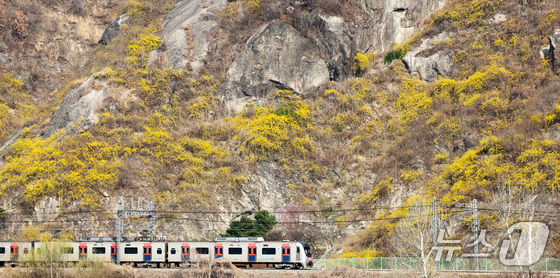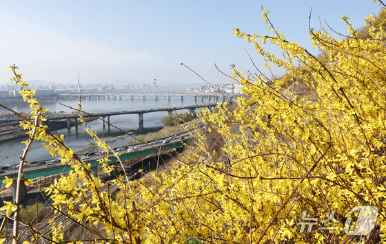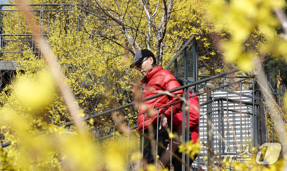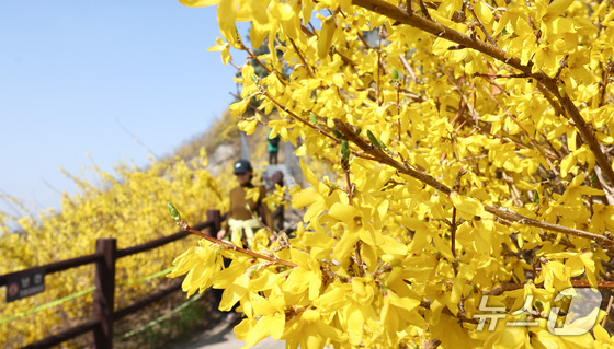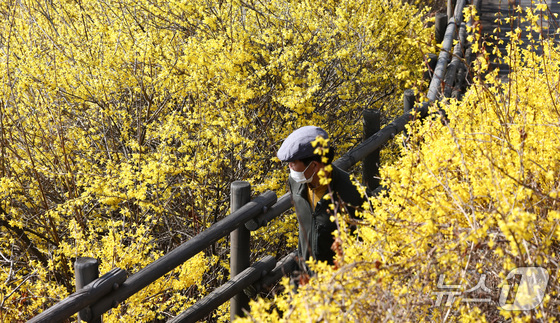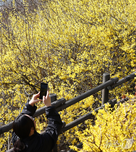 봄의 전령사 개나리가 서울에 찾아왔다. 25일 낮 최고기온이 19℃에 이르는 등 포근한 날씨가 이어지면서 서울 성동구 응봉산은 온통 노랗게 물들었다. 등산복을 차려입은 시민들은 밝은 표정으로 등산로를 거닐며 봄 꽃을 사진으로 담았다.