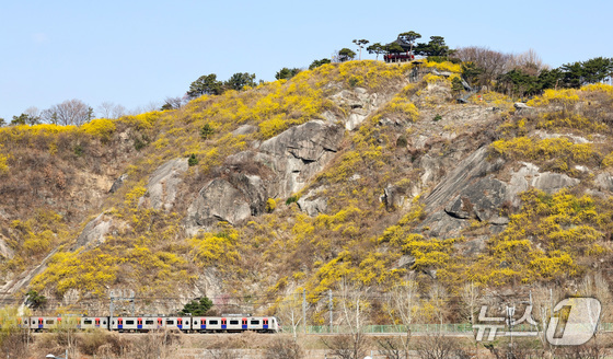 포근한 봄 날씨가 이어지는 25일 서울 성동구 응봉산 일대에 개나리 꽃이 만개해 있다. 2026.3.25 © 뉴스1 최지환 기자