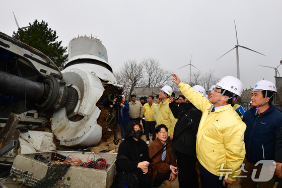 김성환 기후에너지환경부 장관이 25일 지난달 2일 발생한 경북 영덕군 창포풍력발전단지 사고 현장을 찾아 파손된 발전기 부품을 확인하고 있다.2026.3.25 © 뉴스1 최창호 기자