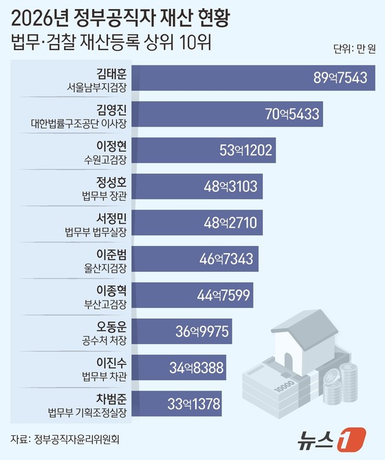 법무부·검찰 고위공무원 평균 재산이 25억 원가량인 것으로 나타났다. 정성호 법무부 장관은 48억 3103만 원의 재산을 신고했다. 이날 재산을 공개한 법무부·검찰 고위공직자 중 김태훈 서울남부지검장이 89억 7543만 원으로 가장 많았다.