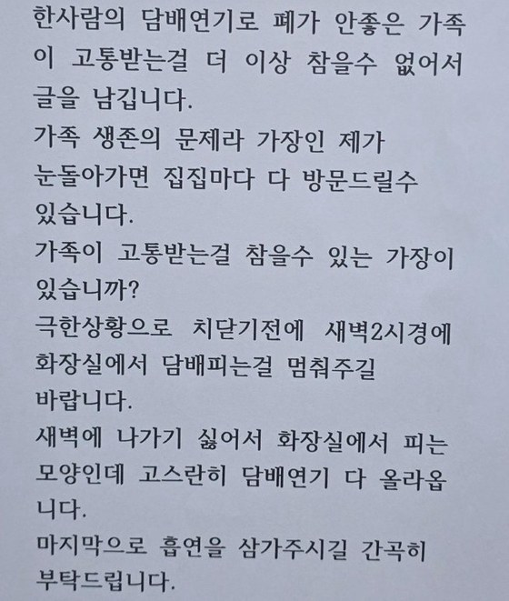 해당 경고문에는 "한 사람의 담배 연기로 폐가 안 좋은 가족이 고통받는 걸 더 이상 참을 수 없어 글을 남긴다"며 "가족 생존의 문제라 가장인 제가 눈 돌아가면 집집마다 다 방문드릴 수 있다"고 경고했다.