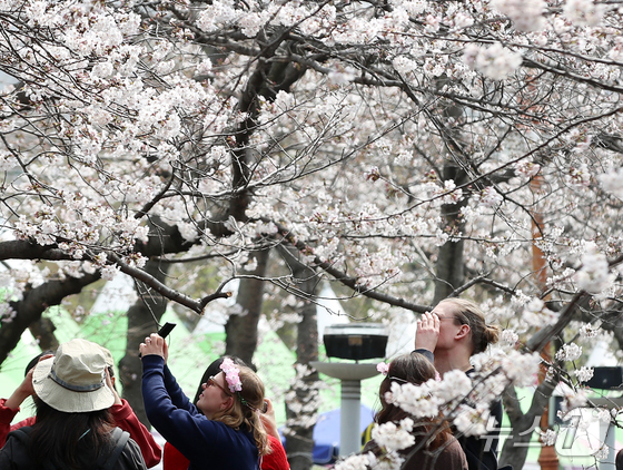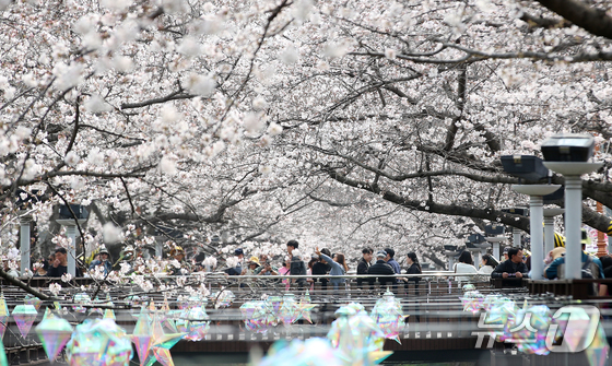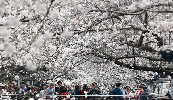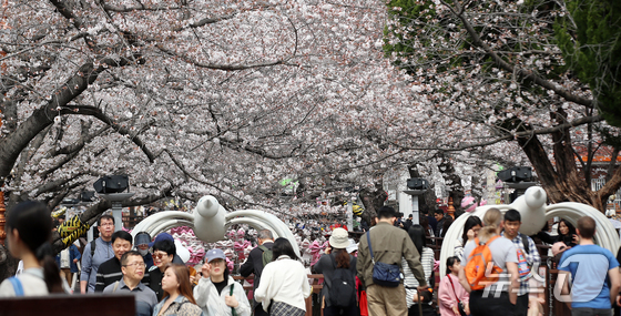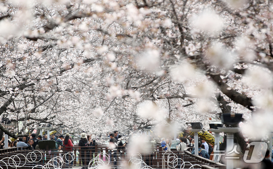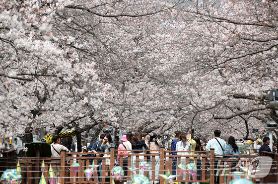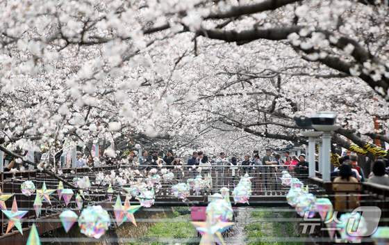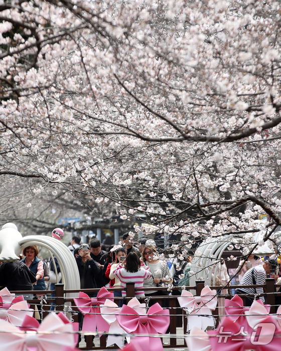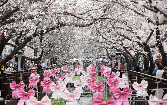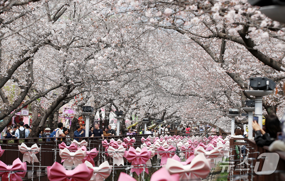 전국 최대 벚꽃 축제인 '제64회 진해군항제'가 개막한 27일 경남 창원 진해구 여좌천을 찾은 관광객들이 벚꽃을 감상하고 있다. 제64회 진해군항제는 이날부터 4월 5일까지 10일간 진해구 전역에서 진행된다. 2026.3.27 © 뉴스1 윤일지 기자
