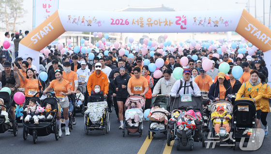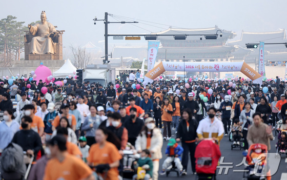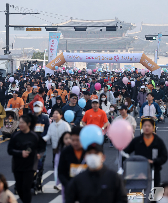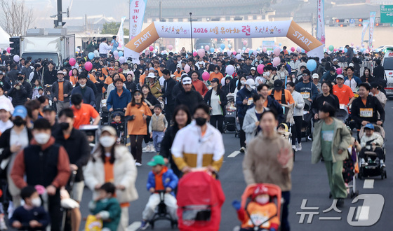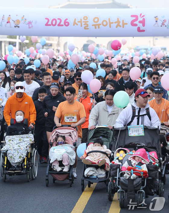 28일 서울 종로구 광화문광장에서 열린 2026 서울 유아차 런 행사에서 참가자들이 힘찬 출발을 하고 있다. 2026.3.28 © 뉴스1 김성진 기자