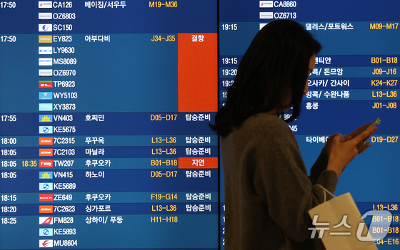 미국과 이스라엘의 이란 공습과 이에 맞선 이란의 보복으로 중동 하늘길이 사실상 마비된 가운데 5일 인천국제공항 1터미널 전광판에 아부다비행 항공편 결항 문구가 표시되고 있다. 2026.3.5 © 뉴스1 오대일 기자
