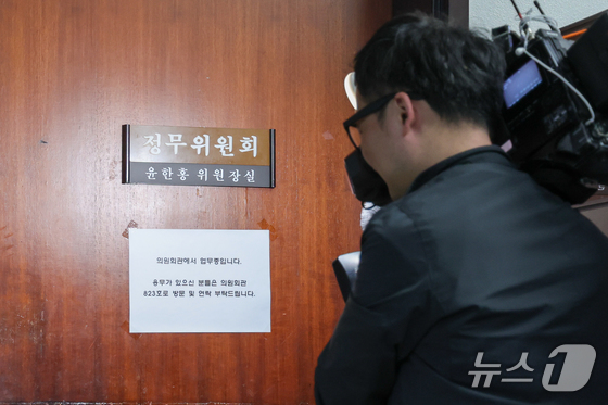 2차 종합특검팀이 윤석열 정부 당시 대통령 관저 이전 특혜 의혹과 관련 국회 정무위원장실을 압수수색 중인 것으로 알려진 26일 서울 여의도 국회 윤한홍 정무위원회 위원장실 앞에 취재진이 대기하고 있다. 2026.3.26 © 뉴스1 안은나 기자