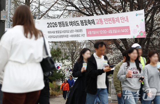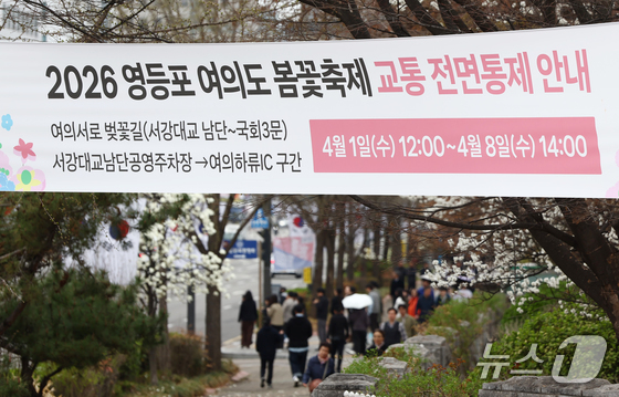 31일 오후 서울 여의도 윤중로 벚꽃길 인근에 2026 여의도 봄꽃축제 교통 전면통제 안내 현수막이 걸려 있다. 서울을 대표하는 '여의도 봄꽃축제'는 다음 달 3일부터 7일까지 열리며, 다음 달 1일부터 8일까지 인근 지역 차량 출입이 통제된다. 2026.3.31 © 뉴스1 김민지 기자