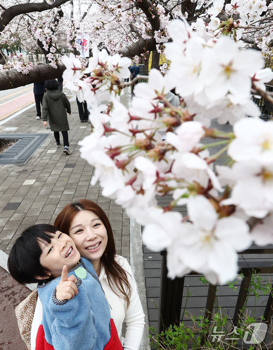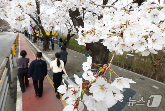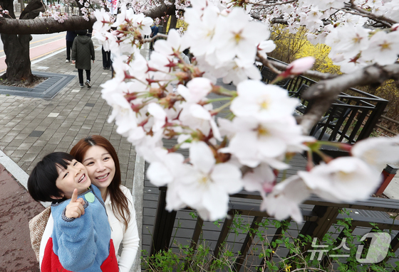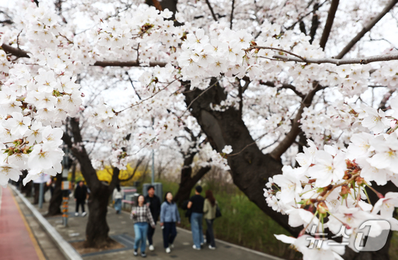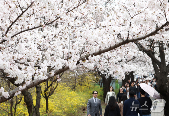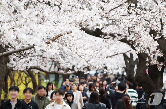따뜻한 봄 날씨를 보인 31일 오후 서울 여의도 윤중로 벚꽃길에서 시민들이 활짝 핀 벚꽃을 즐기고 있다. 서울을 대표하는 '여의도 봄꽃축제'는 다음 달 3일부터 7일까지 열린다. 2026.3.31 © 뉴스1 김민지 기자