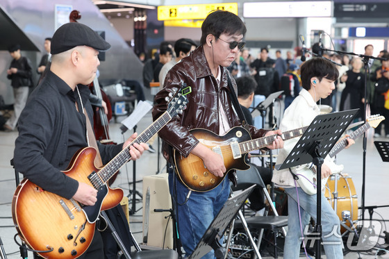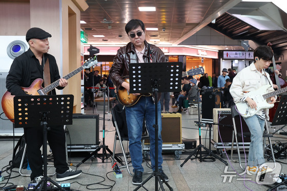 최휘영 문화체육관광부 장관이 1일 오후 서울 중구 서울역에서 열린 '문화가 있는 날' 확대 기념 행사에서 기타를 연주하며 공연에 참여하고 있다. 2026.4.1 © 뉴스1 이광호 기자