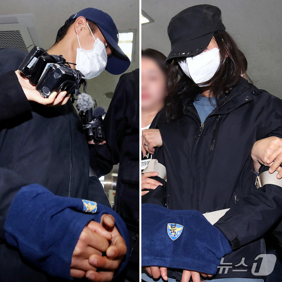 50대 장모를 살해하고 여행용 가방(캐리어)에 담아 대구 북구 신천 잠수교 인근에 버린 혐의(존속살해 등)를 받는 20대 사위(왼쪽)와 시체유기 등 범행에 가담한 20대 딸이 2일 오전 구속 전 피의자 심문(영장실질심사)을 받기 위해 대구지방법원에 도착하고 있다. (*모자이크 유무는 각사 판단에 따라 처리 바랍니다.)2026.4.2 © 뉴스1 공정식 기자