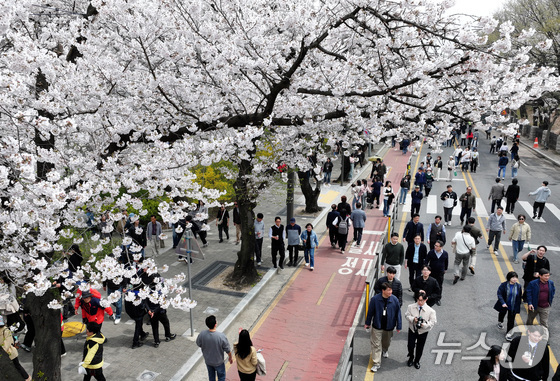서울 여의도 봄꽃축제가 개막한 3일 서울 영등포구 여의서로 일대가 방문객으로 인산인해를 이뤘다. 평년보다 포근한 날씨에 만발한 꽃잎은 진한 꽃향기를 사방으로 퍼트렸다.