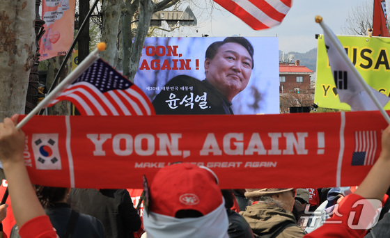 윤석열 전 대통령이 탄핵된 지 1년을 맞은 4일 서울 종로구 헌법재판소 인근에서 열린 윤 어게인 집회에서 윤 전 대통령 지지자들이 구호를 외치고 있다. 2026.4.4 © 뉴스1 임세영 기자