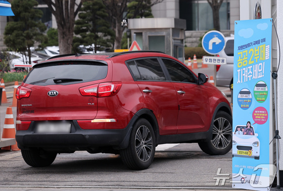 6일 서울 종로구 정부서울청사 입구에 자동차 공공기관 2부제 안내문이 붙어있다. 오는 8일부터 공공기관에는 자동차 2부제(홀짝제), 공공기관이 운영하는 공영주차장에는 5부제(요일제)가 시행된다. 이번 조치는 미국·이스라엘과 이란 간 전쟁으로 자원 안보 위기 경보가 3단계인 '경계' 단계로 격상됨에 따른 수요관리 강화 조치다. 시행 기간은 4월 8일부터 위기 경보 해제 시까지 한시적으로 운영된다. 2026.4.6 © 뉴스1 김성진 기자