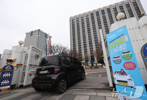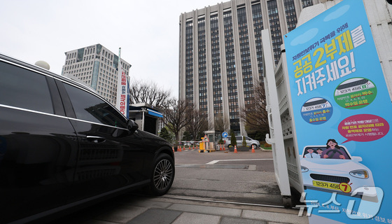 6일 서울 종로구 정부서울청사 입구에 자동차 공공기관 2부제 안내문이 붙어있다. 2026.4.6 © 뉴스1 김성진 기자