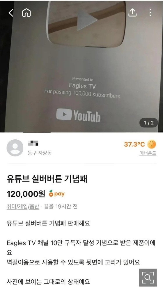 문제가 된 게시글에는 "유튜브 실버버튼 기념패를 판매한다"며 "이글스TV 채널 10만 구독자 달성 기념으로 받은 제품으로 벽걸이용으로 사용할 수 있도록 뒷면에 고리가 있다"고 제품 상태를 설명했다.