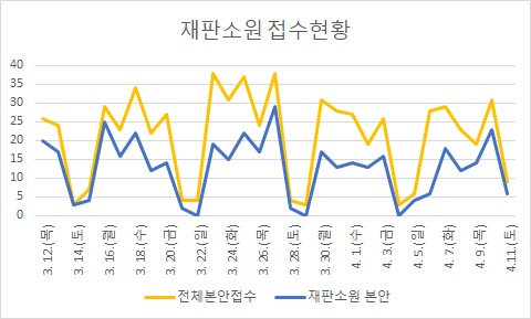 재판소원 제도가 시행된 지난달 12일부터 지난 11일까지 31일간 헌재에는 총 395건의 재판소원 사건이 접수됐다. 하루 평균 12.7건꼴이다.