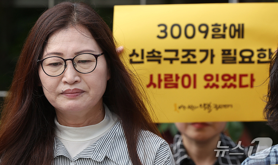 서울 서초구 서울중앙지법 삼거리 앞에서 열린 4월 16일의 약속 국민연대(4·16 연대) 주최 구조방기에 관한 손해배상 판결 및 피해가족과 시민의 입장 발표 기자회견에서 고 임경빈 군의 어머니 전인숙 씨가 참석해 생각에 잠겨 있다. 2024.6.10 © 뉴스1 김진환 기자
