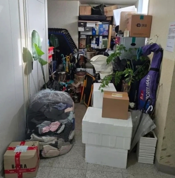 공개된 사진에는 복도 한쪽에 음식이 담겼던 것으로 추정되는 스티로폼 보냉 박스와 각종 생활용품들, 골프백, 우산, 화분 등이 빼곡히 쌓여 통행이 어려운 모습이다.