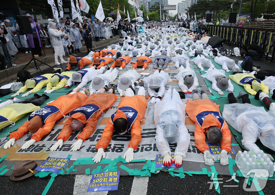 이들은 우비를 입고 '발달장애 자립 지원', '발달 장애 국가 돌봄', '통합 교육 지원 확대', '시설 참사 국정 조사' 등이라 외치며 바닥에 엎드렸다 일어나기를 100회 반복했다.