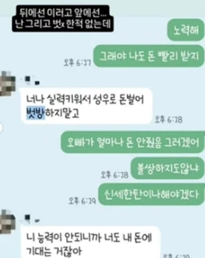 해당 대화에서 서유리가 "노력해. 그래야 나도 돈 빨리 받지"라고 말하자, 상대는 "너나 실력 키워서 성우로 돈 벌어라. 벗방(벗는 방송) 하지 말고"라고 답했다.