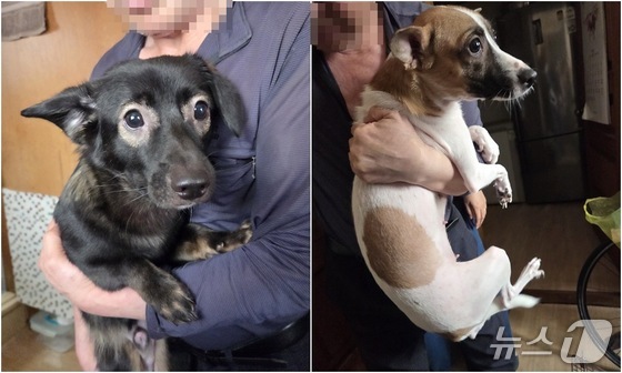 구로구 애니멀호딩 현장에서 구조된 '까불이(왼쪽, 수컷, 9개월령)'와 '바둑이(암컷, 1살)'. 물안경을 쓴듯한 털색과 순한 성격이 돋보였다. © 뉴스1 한송아 기자