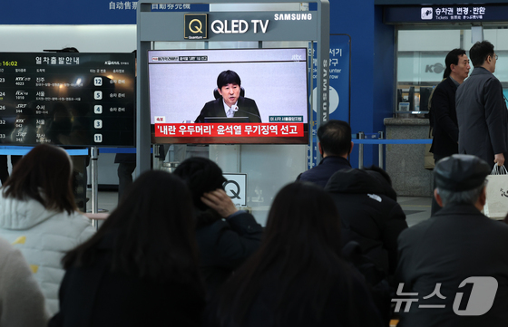 대전역 대합실에서 시민들이 윤석열 전 대통령의 내란 우두머리 혐의 1심 선고 생중계를 시청하고 있다. © 뉴스1