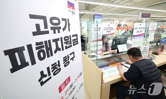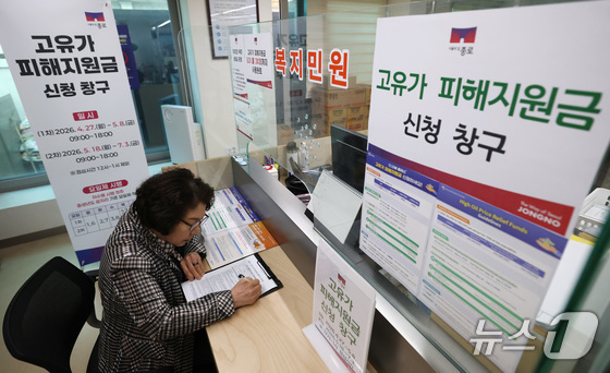 27일부터 기초생활수급자, 차상위계층·한부모가족 등을 대상으로 '고유가 피해지원금' 1차 지급 신청이 시작됐다. 이날 서울 종로구 사직동 주민센터에 '고유가 피해지원금' 신청 안내문이 붙어있다. 2026.4.27 © 뉴스1 임세영 기자