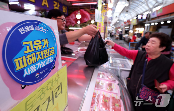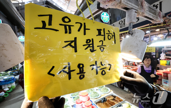 고유가 피해지원금 1차 지급 신청일인 27일 서울 동대문구 경동시장 한 점포에 ’고유가 피해지원금 사용 가능‘ 안내문이 게시돼 있다. 2026.4.27 © 뉴스1 임지훈 인턴기자