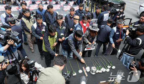 전국민주노동조합총연맹(민주노총) 공공운수노조 화물연대 관계자들이 28일 서울 강남구 BGF리테일 본사 앞에서 열린 '원청교섭 회피 CU BGF 규탄! 민주노총 결의대회'에서 헌화하고 있다. 2026.4.28 © 뉴스1 김진환 기자