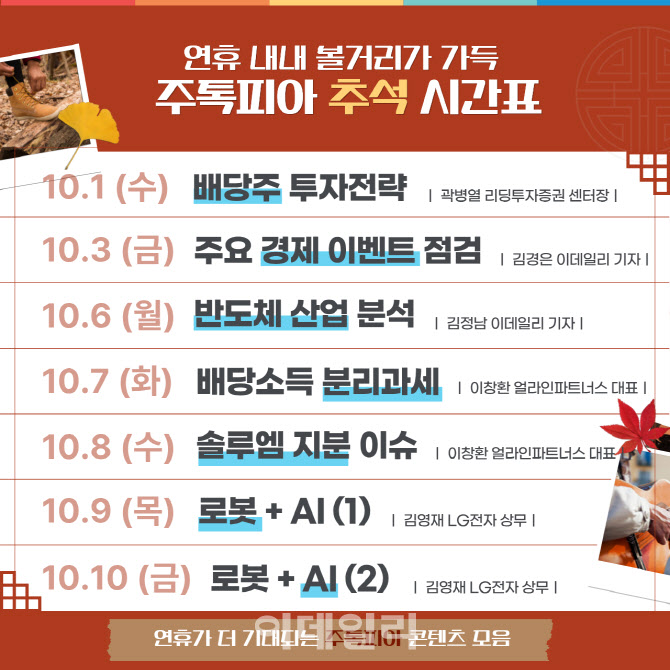 3~10일까지 주톡피아 채널을 통해 경제지표, 배당소득 분리과세 정책, 반도체 투자 동향, 인공지능(AI)과 로봇 산업 등 다양한 주제에 대한 전문가들의 인사이트를 만나볼 수 있다.