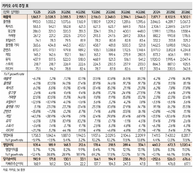 그는 “숏폼 지면 내 트래픽이 안정적으로 증가하면 동영상 광고 상품이 다양해지며 광고 매출에 의미있는 기여를 할 것으로 기대된다. 4분기에 추가적인 톡 UI·UX 개편을 계획하고 있어 이에 따른 플랫폼 편의성이 개선될 수 있을 것”이라고 내다봤다.