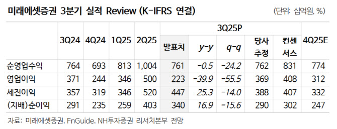 총 투자목적자산 관련이익은 930억원으로 여기에는 혁신기업, 네이버파이낸셜 평가이익, 해외 호텔 손실 1598억원 등이 반영됐다. 트레이딩의 경우 별도기준 손익은 2412억원을 기록했다. 채권운용이익이 전분기 대비 하락했으며 IB의 미매각 대체투자자산 평가손실 확대 영향이 컸다는 평가다.
