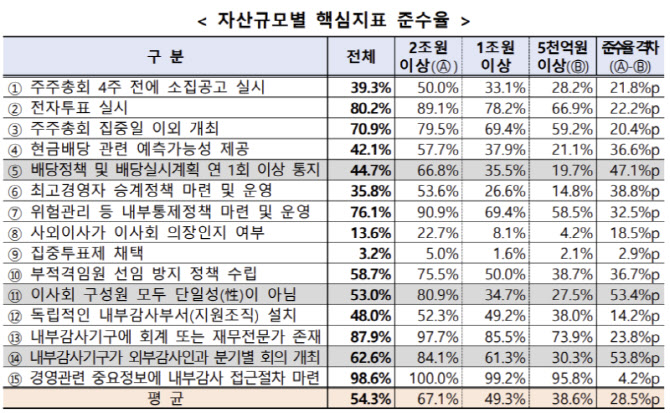 올해 핵심지표 평균 준수율은 54.3%로 전년(48.7%) 대비 5.6%포인트 상승했다. 자산 2조원 이상 기업의 준수율은 67.1%로 가장 높았고, 1조원 이상~2조원 미만 기업은 49.3%, 5000억원 이상~1조원 미만 기업은 38.6%에 그쳤다.