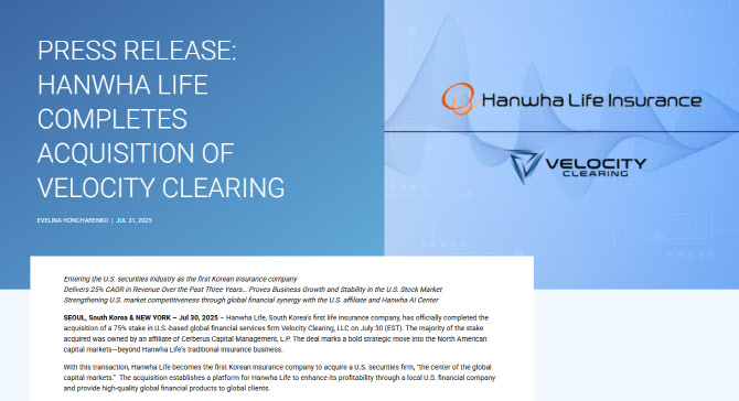 한화생명은 국내 보험사 최초로 지난 7월 미국 브로커딜러(증권사) 벨로시티 지분 75%를 인수했다.