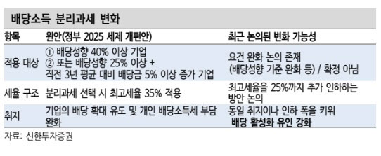 배당소득 분리과세 적용요건 등은 주요 쟁점으로 남아 있다. 정부안에 따르면 배당소득 분리과세 적용 대상은 ‘배당 성향 40% 이상 기업’ 또는 ‘배당 성향 25% 이상이면서 직전 3년 평균 대비 5% 이상 배당을 늘린 기업’이다.