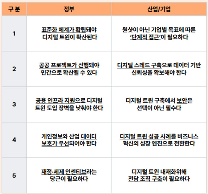 기업 측면에서는 단일 기업의 목표에 머무르지 않고 산업 전체의 혁신을 견인할 수 있는 단계적 접근이 필요하며 △디지털 트윈 구축을 위한 데이터 기반 신뢰성 확보 △실제 현장에 맞는 비즈니스 모델 개발 △글로벌 수준의 품질·표준 확보 등 실질적 실행력이 요구된다고 진단했다.