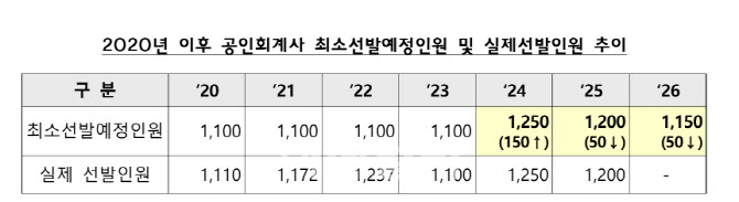 금융위는 2026년도 최소선발예정인원을 결정하면서 △미채용 합격생 누적에 따른 수급부담 △회계법인의 매출·수익 정체 △비회계법인의 회계사 채용수요 △수험생 예측가능성 등을 종합적으로 고려했다고 설명했다.