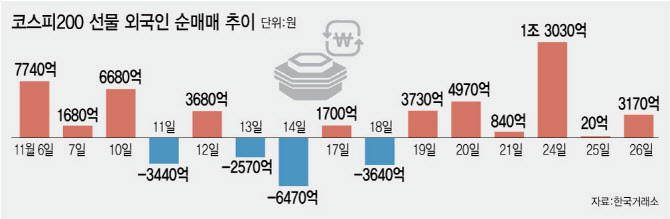 지난 19일부터 이날까지 외국인은 코스피200선물 시장에서 6거래일 연속 순매수를 기록하며 총 1조9440억원 규모의 매수 포지션을 쌓았다. 같은 기간 현물 시장에서는 3조4000억원을 순매도해 상반된 행보를 보였다.