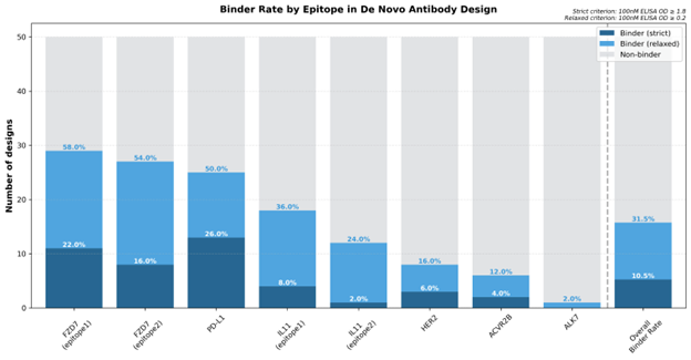 드노보 설계 항체가 모든 타깃에서 결합력을 보이는 모습. 평균 31.5% 성공률 기록(자료=갤럭스)